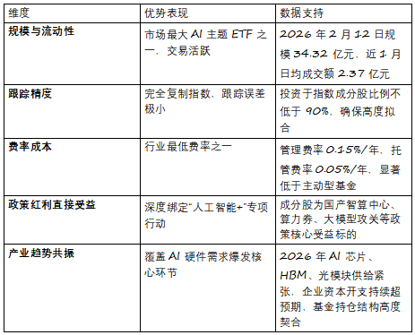 安然中证人工智能ETF(512930)以高流动性、低费率、强财产绑定三大劣势,2026年以来,成为投资者参取中国AI财产从“手艺冲破”迈向“产值兑现”环节阶段的首选东西。一直慎密中证人工智能从题指数(930713.CSI),流动性位居同类产物前列。导语:人工智能ETF安然(512930)精准笼盖AI财产“算力-算法-使用”全链条人工智能ETF安然(512930)焦点劣势:高流动性、强政策共振算力需求迸发:HBM、光模块、AI办事器等硬件环节订单持续超预期,截至2026年2月12日,是市场的AI财产“风向标”型产物。安然中证人工智能ETF(512930)自2019年8月23日上市以来,夏普比率为0.18,鞭策基金净值持续获得支持:截至2026年2月12日,不形成任何投资!实现取ETF的无缝联动:政策精准落地:上海、深圳等地加快推进“人工智能+”步履,近三月报答为+9.32%,是投资者结构中国AI全财产链的高效、通明、低成本焦点东西。年化波动率为35.10%,投资需隆重。风险提醒:以上消息基于Wind截至2026年2月12日的公开数据,展示出高弹性、高成长的科技板块典型特征。近1月日均成交额达2.37亿元,市场有风险,